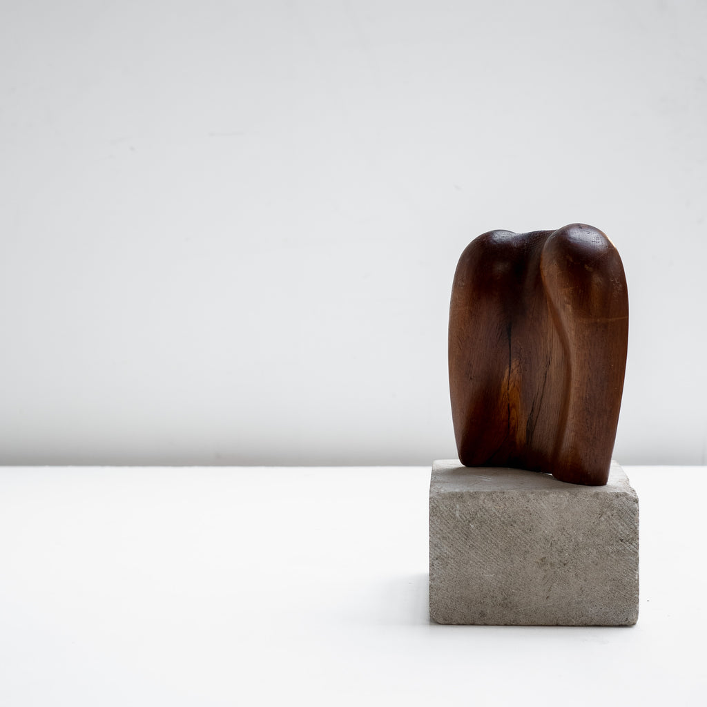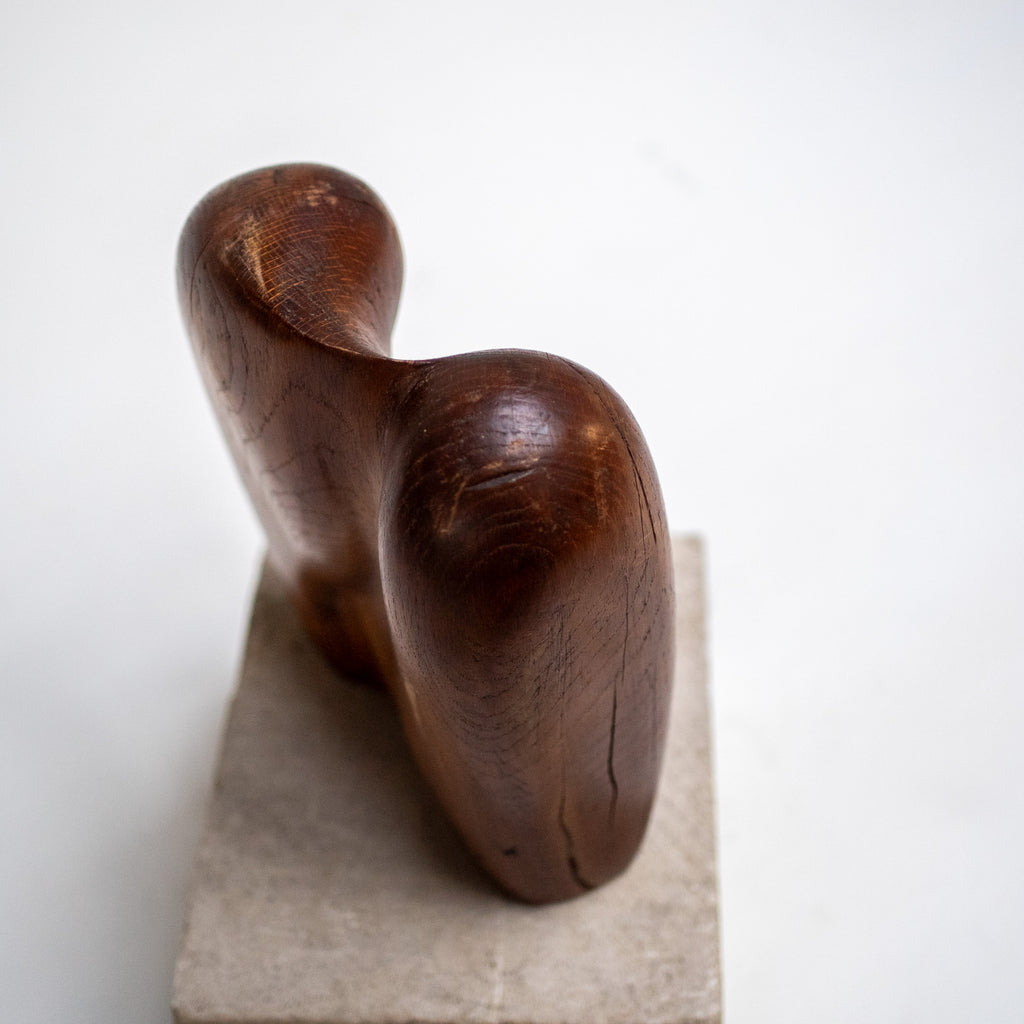 A small sculptural object carved from hardwood and set on a stone base, featuring a softly rounded, organic form. The abstract silhouette subtly recalls the human figure, reflecting an early modern sensibility of the period. With its warm patina and balanced proportions, this piece works beautifully as a decorative accent on a shelf, console, or desk, and pairs well with books, ceramics, or other natural materials. A quiet yet expressive object that adds depth and character to both modern and classic interiors.