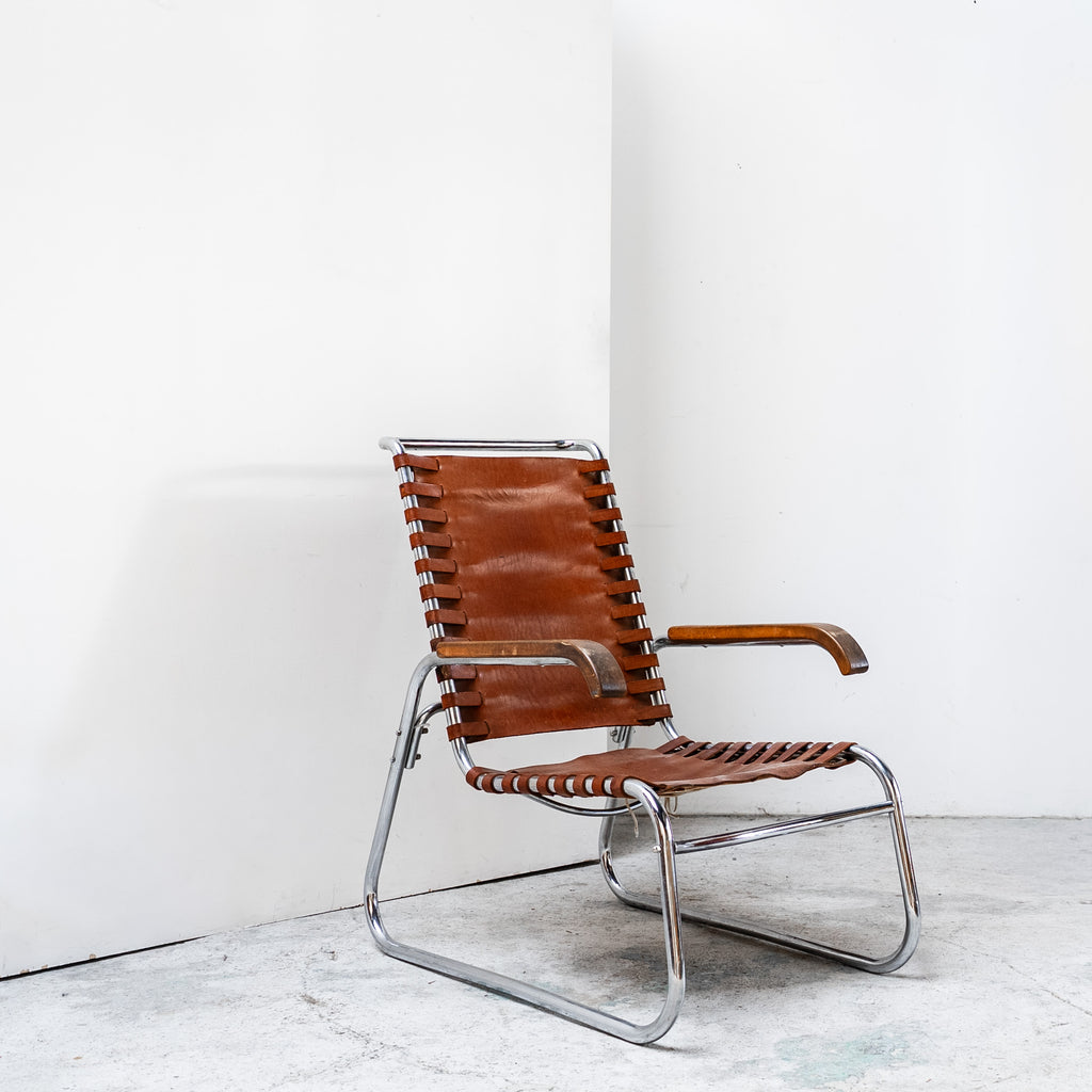 オランダのヴェーハ社製、マルセル・ブロイヤーのユニークなS35ラウンジチェア(1930年代)。この特定のサドルレザー張りは現存2点のみ。特注品である可能性が高い。ヴェーハ社は1930年代初頭に本椅子の製造権を取得した。ヴェーハはハーグの大手鉄鋼会社J.B.ファン・ヘイストのブランド名であり、ヴェハ暖房用ラジエーターで長年知られていた。1932年頃から1937年頃にかけて、J.B.ファン・ヘイストは鋼管家具シリーズも展開。椅子、アームチェアなど。
