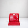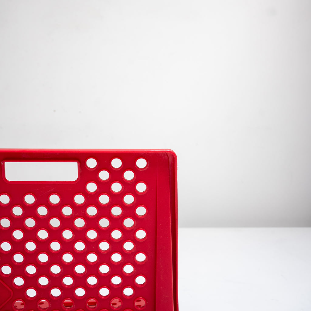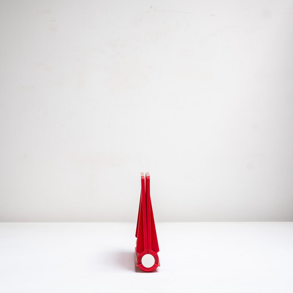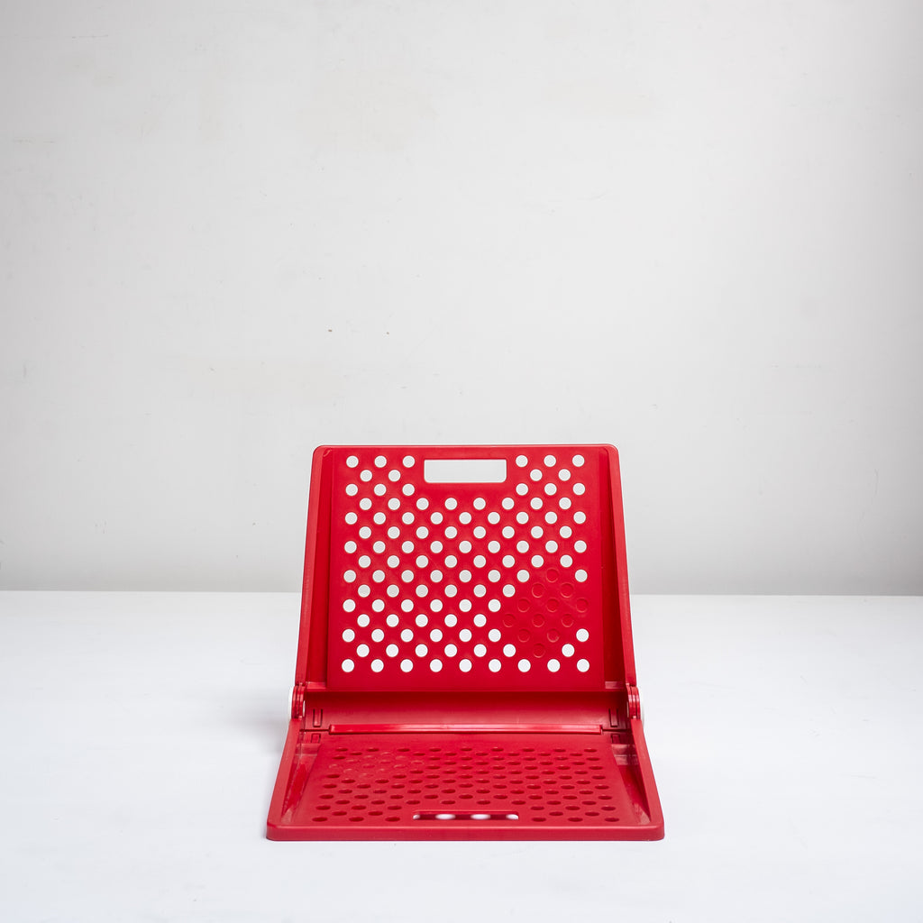 座面と背面に施された円形のカットアウトが特徴で、幾何学的なリズムと軽快さを感じさせるデザインです。鮮やかなレッドカラーが空間にアクセントを与え、折りたたみ式の構造によりコンパクトに収納可能。実用性とグラフィカルな造形美を兼ね備えた一脚です。