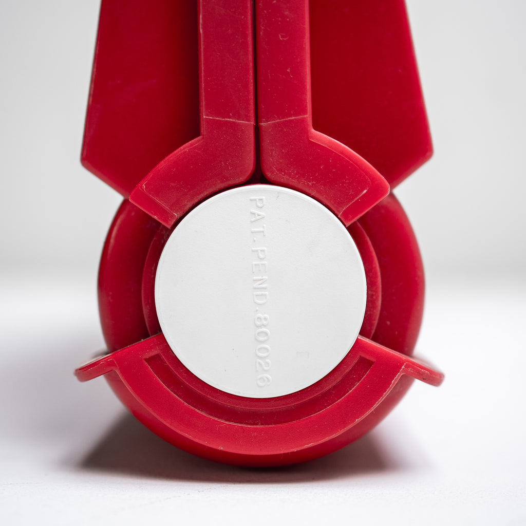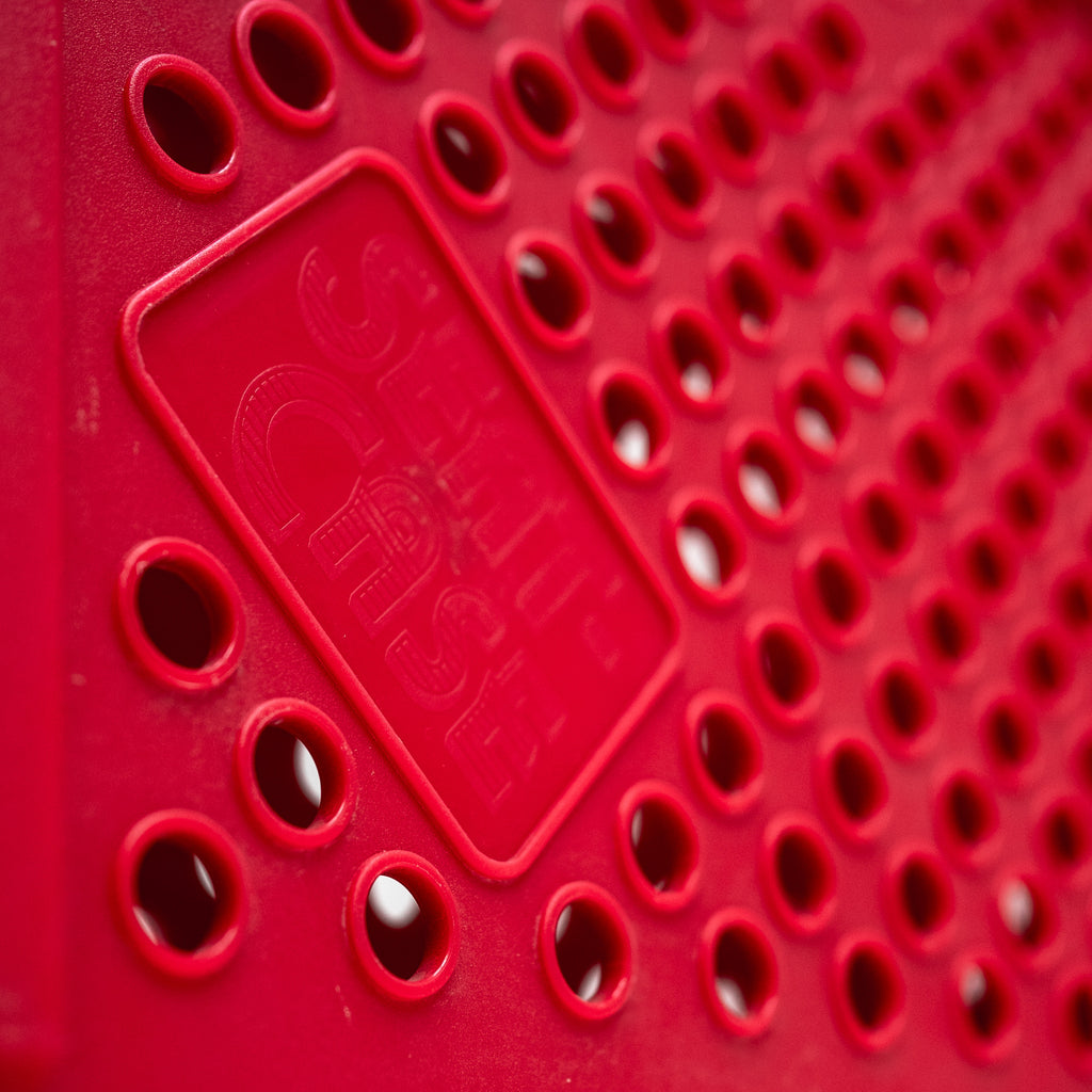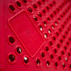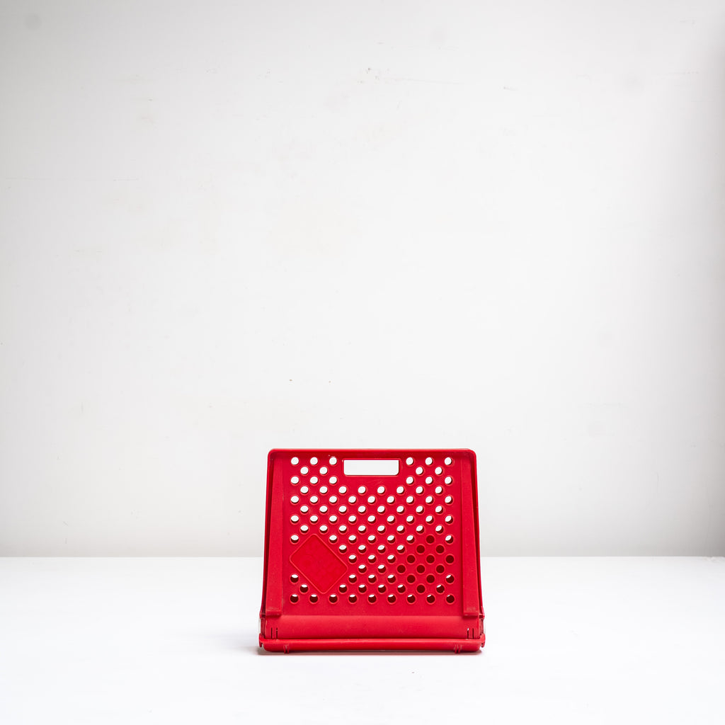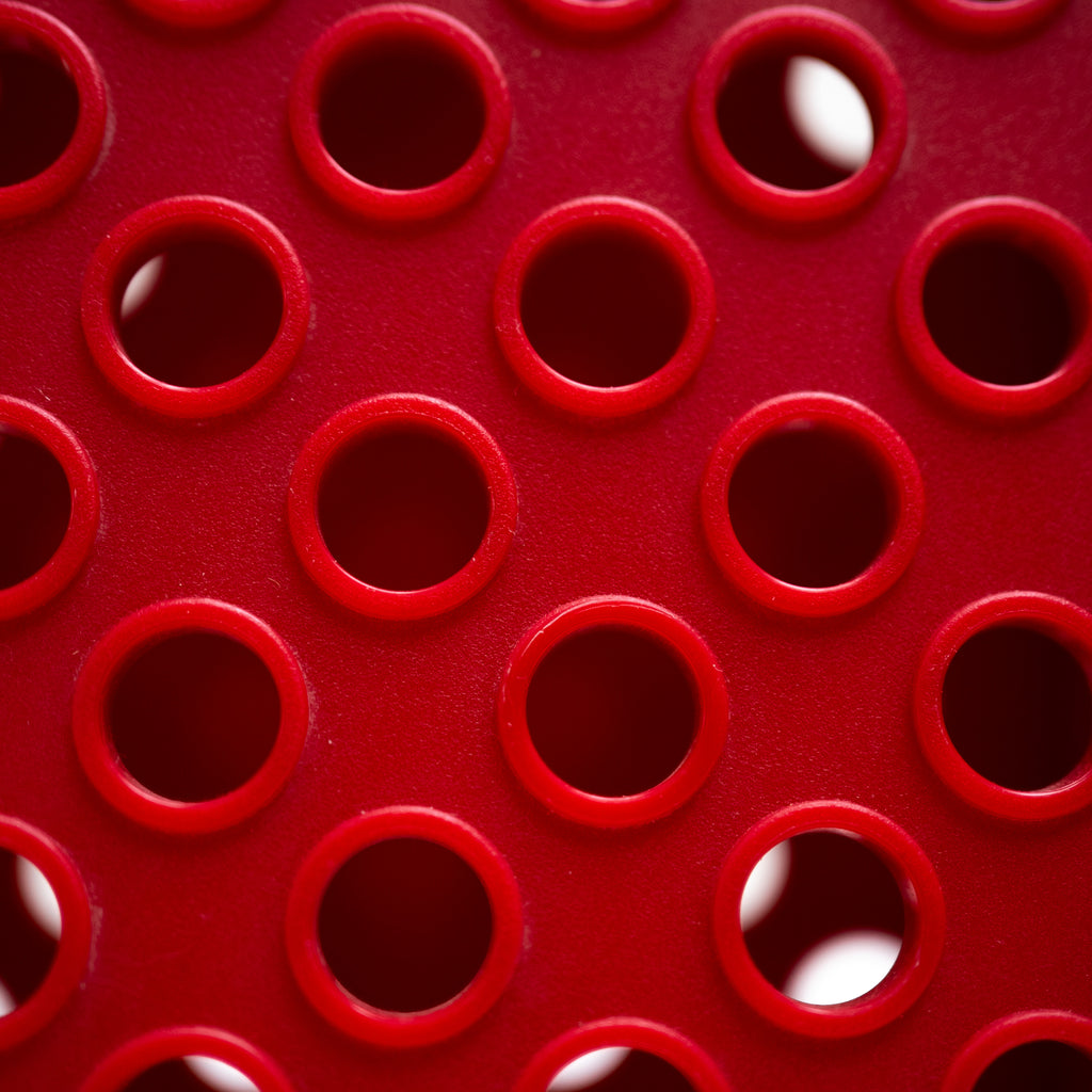 座面と背面に施された円形のカットアウトが特徴で、幾何学的なリズムと軽快さを感じさせるデザインです。鮮やかなレッドカラーが空間にアクセントを与え、折りたたみ式の構造によりコンパクトに収納可能。実用性とグラフィカルな造形美を兼ね備えた一脚です。