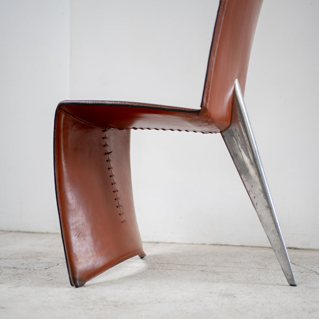 A striking postmodern chair designed by Philippe Starck and produced by the Aleph, Driade. The chair features a slender aluminum leg supporting a curved leather seat and backrest, creating a dynamic silhouette that appears almost floating. The contrast between the industrial metal structure and the warm leather surface gives the piece both elegance and character.