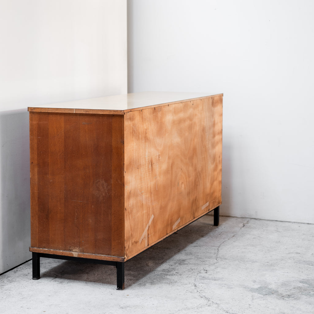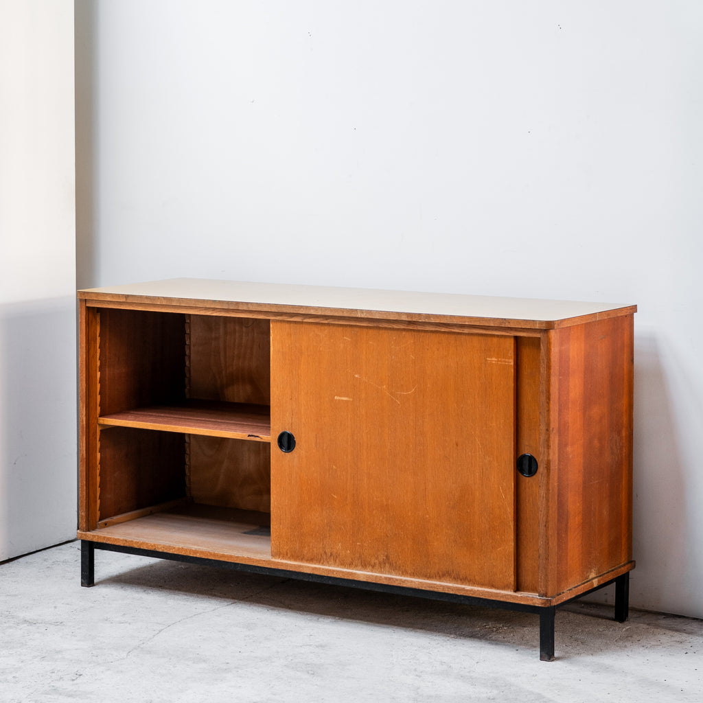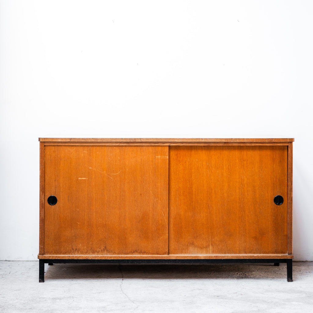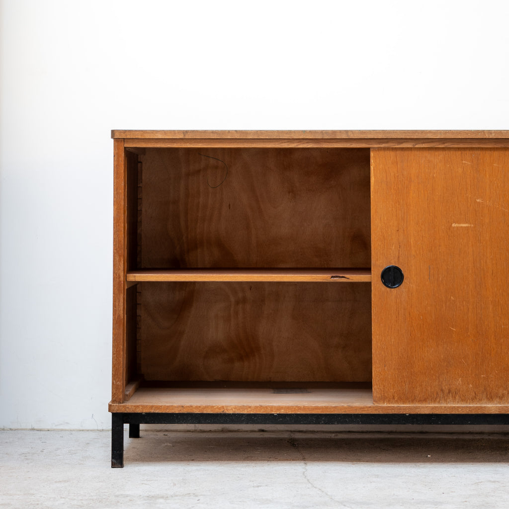 Elegant French vintage cabinet featuring clean lines, sliding wooden doors, and slim black metal legs. The warm wood surface contrasts beautifully with the minimalist structure, reflecting the refined functional aesthetic of French mid-century design. Its restrained geometry and timeless proportions make it suitable for a wide range of interiors — from modern living spaces to more eclectic settings.