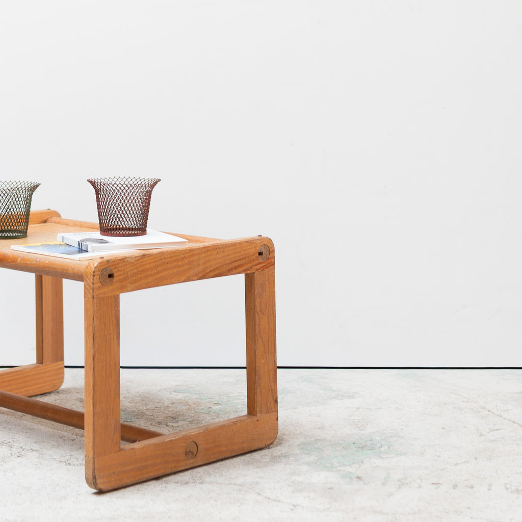 Small French wooden table from the 1980s, featuring a minimalist open-frame structure and warm natural patina. Its compact size and sculptural simplicity make it ideal as a side table, low display stand, or accent piece. A quiet yet distinctive object that blends easily into modern and eclectic interiors.