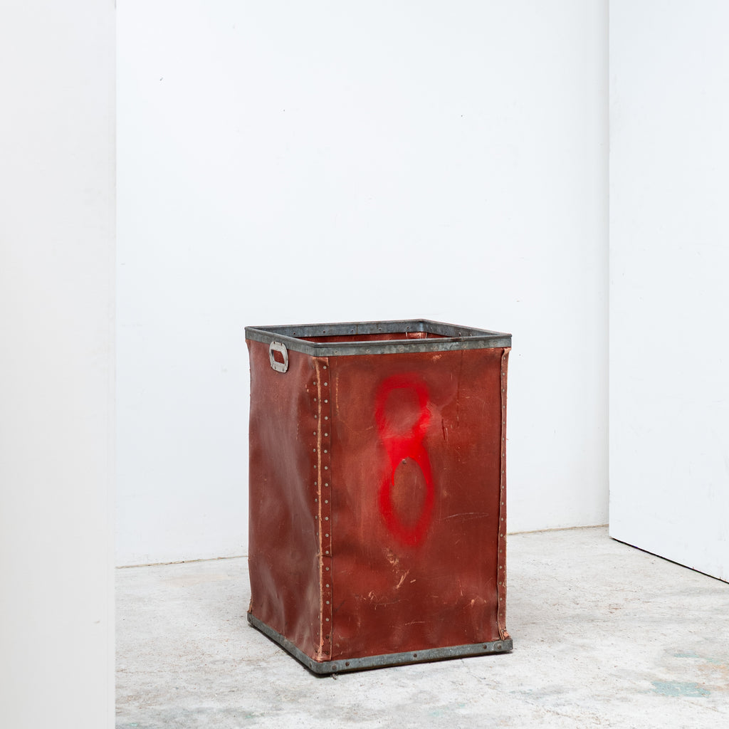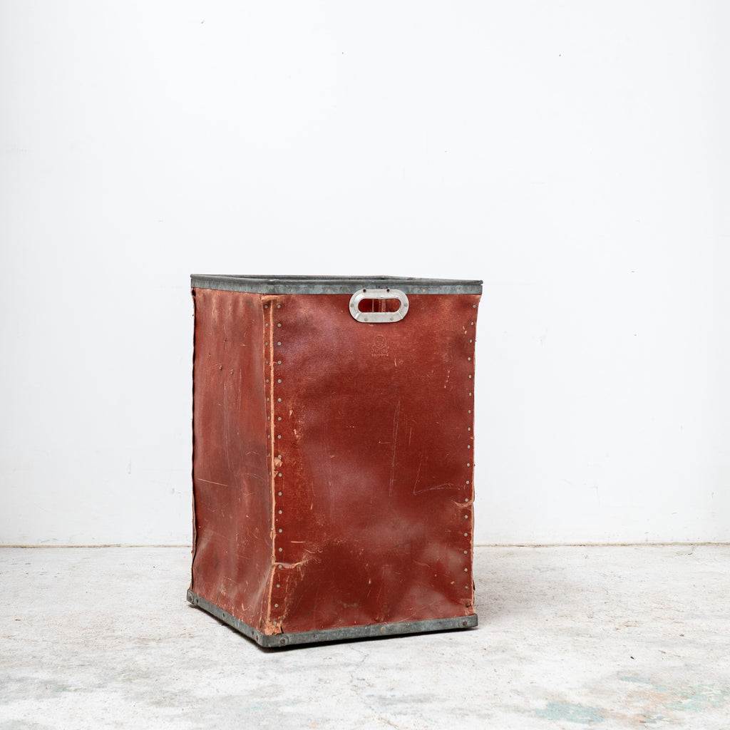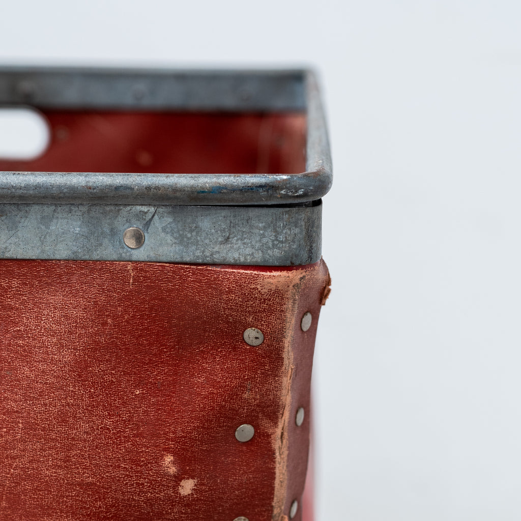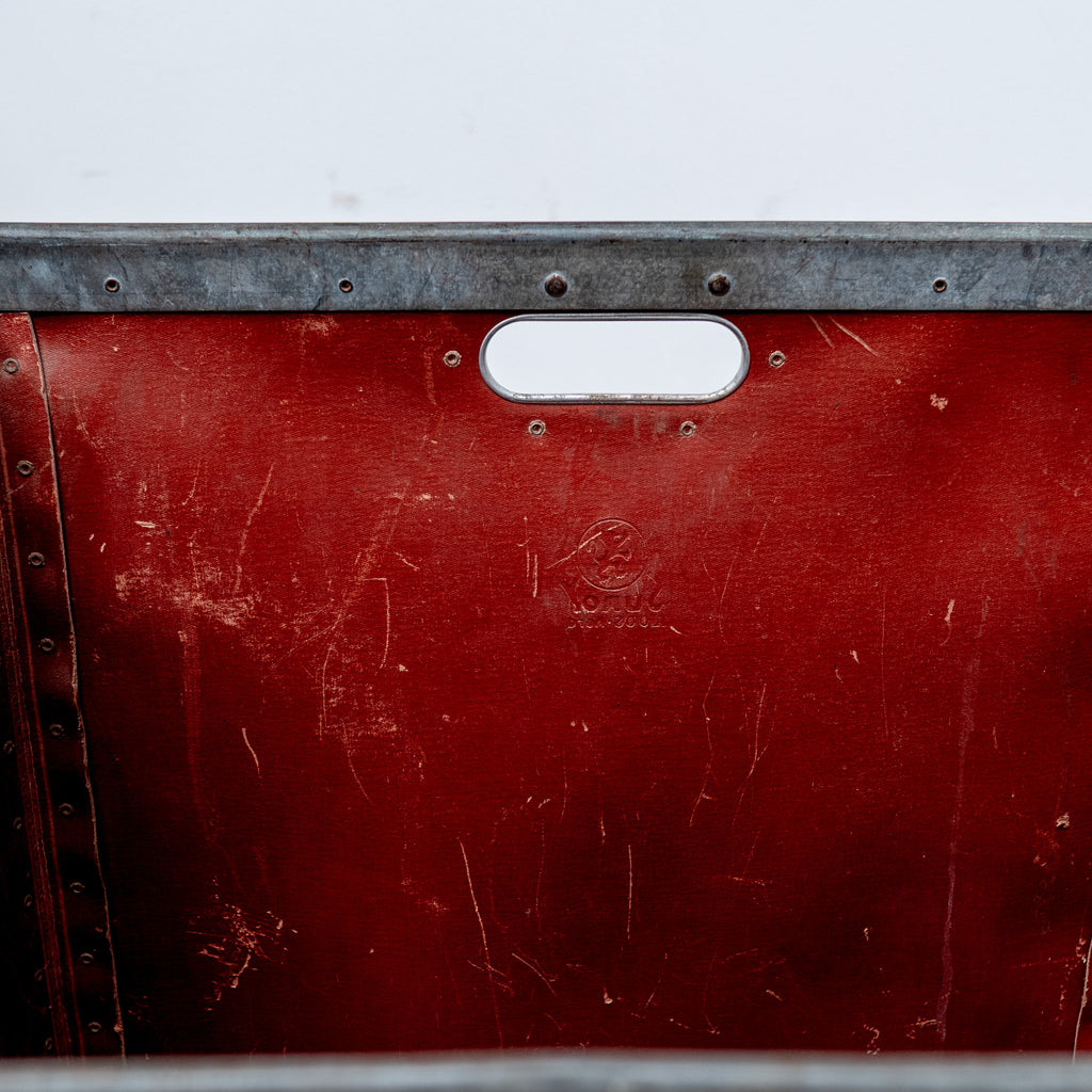 Constructed from red fiber with riveted details and embossed maker’s mark - SUROY. Originally used in French factories for material storage, now appreciated as a sculptural industrial object with a rich patina or as your unique storage tool.