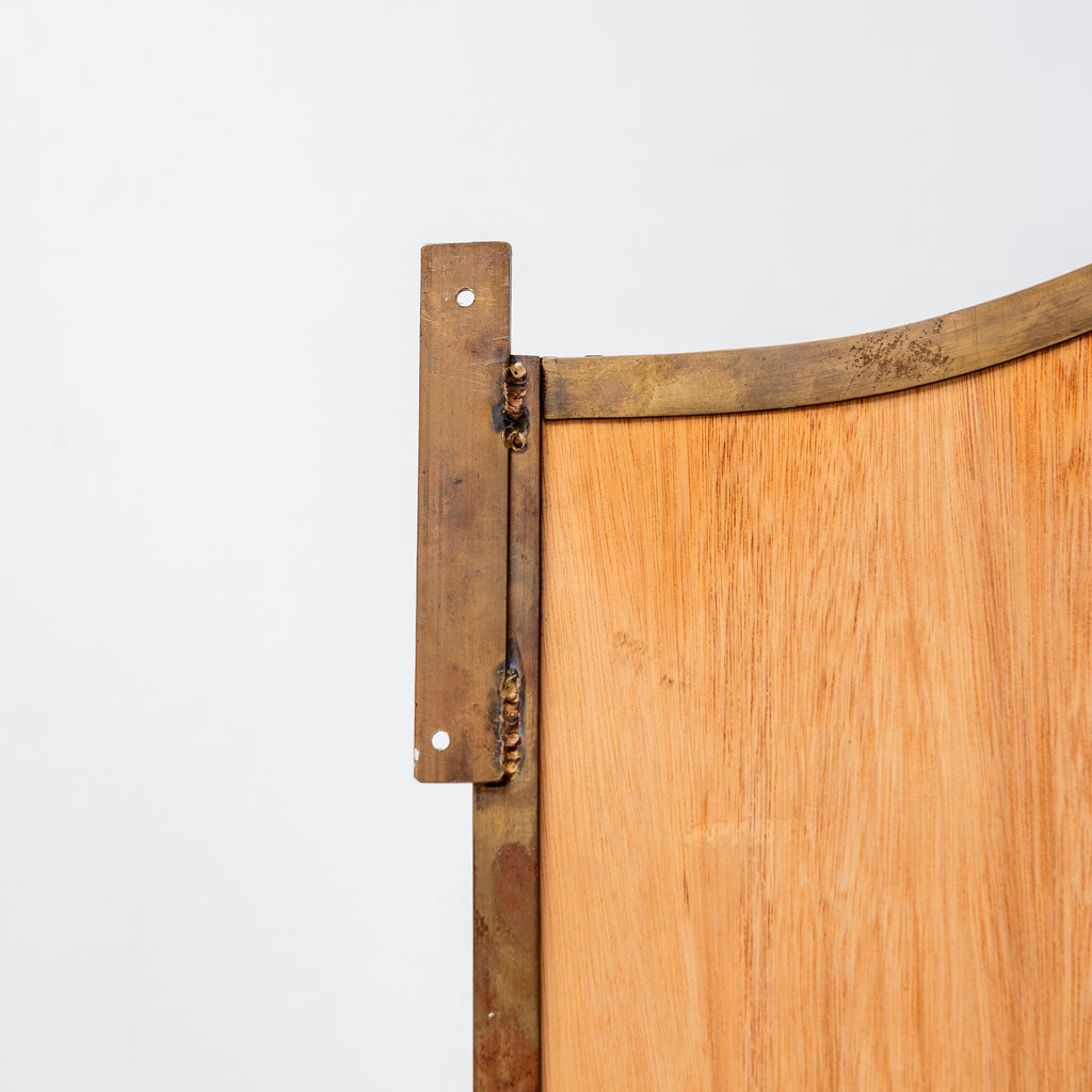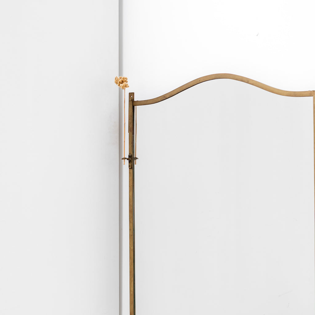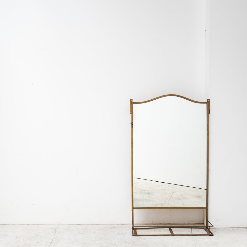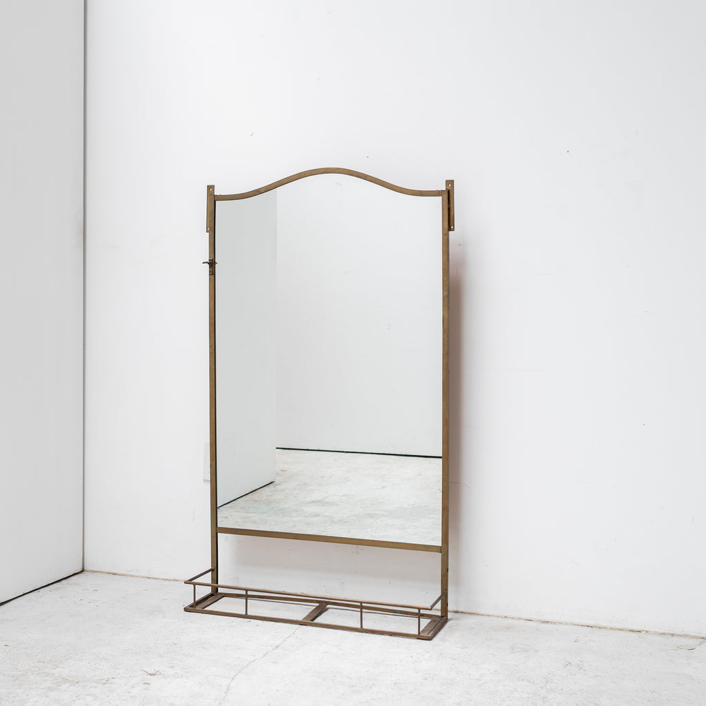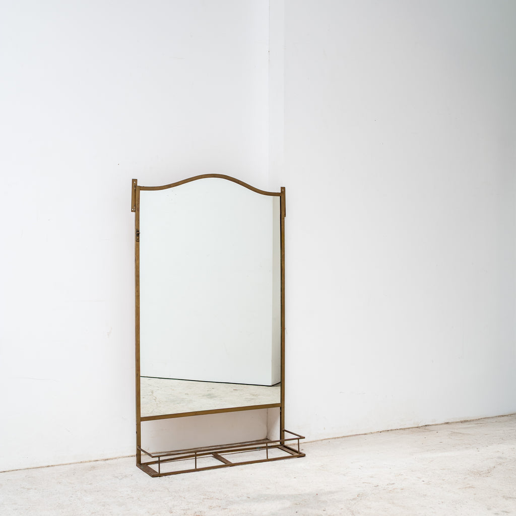 A tall wall or floor-standing mirror with an elegant arched frame and lower metal tray detail. Its refined structure and natural patina give a timeless presence, suitable for both residential and gallery atmosphere. Can be easily mounted on a wall, serving as a functional and decorative accent in a living room, hallway, or dressing space.