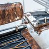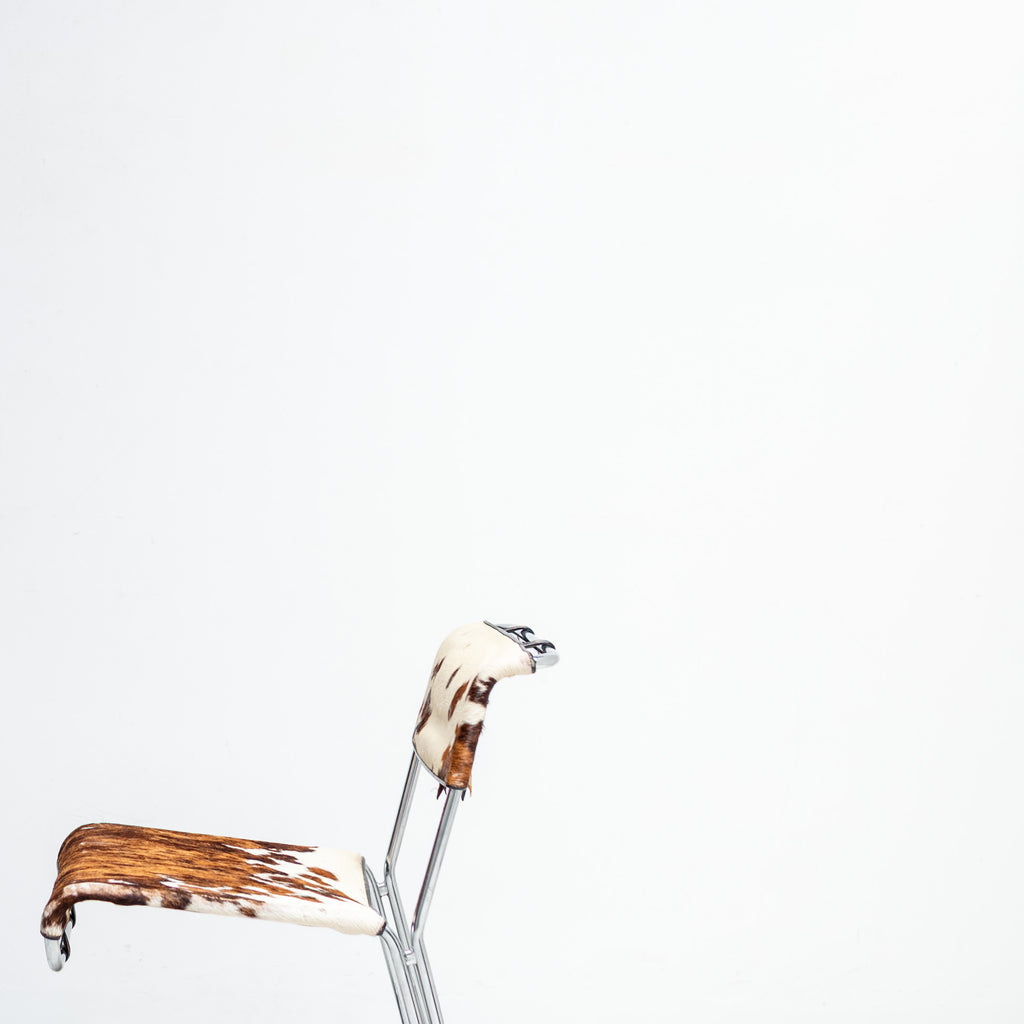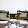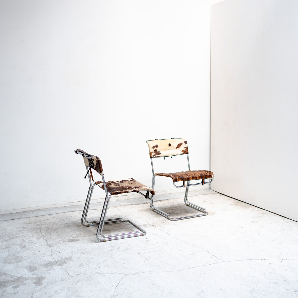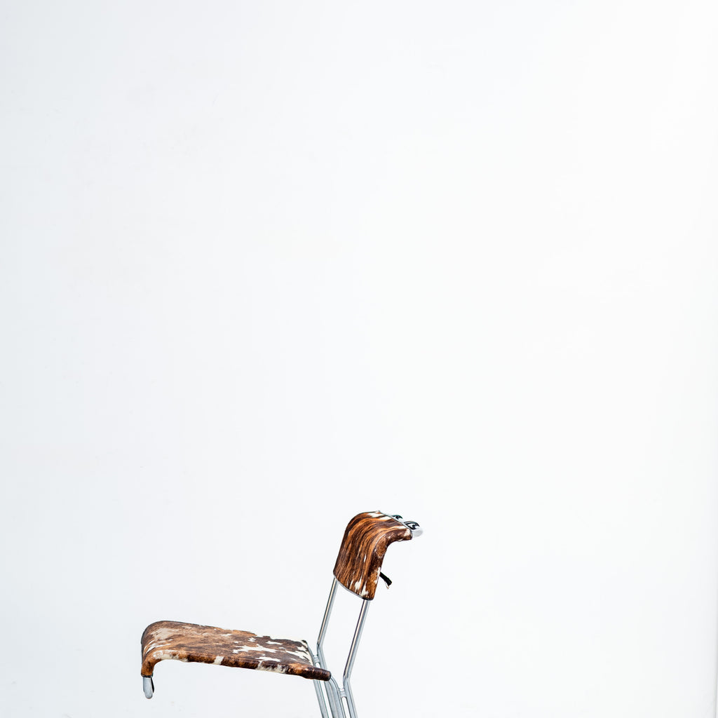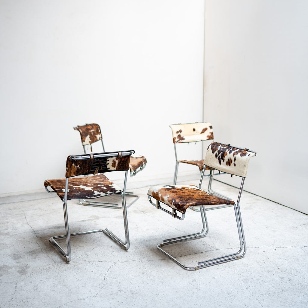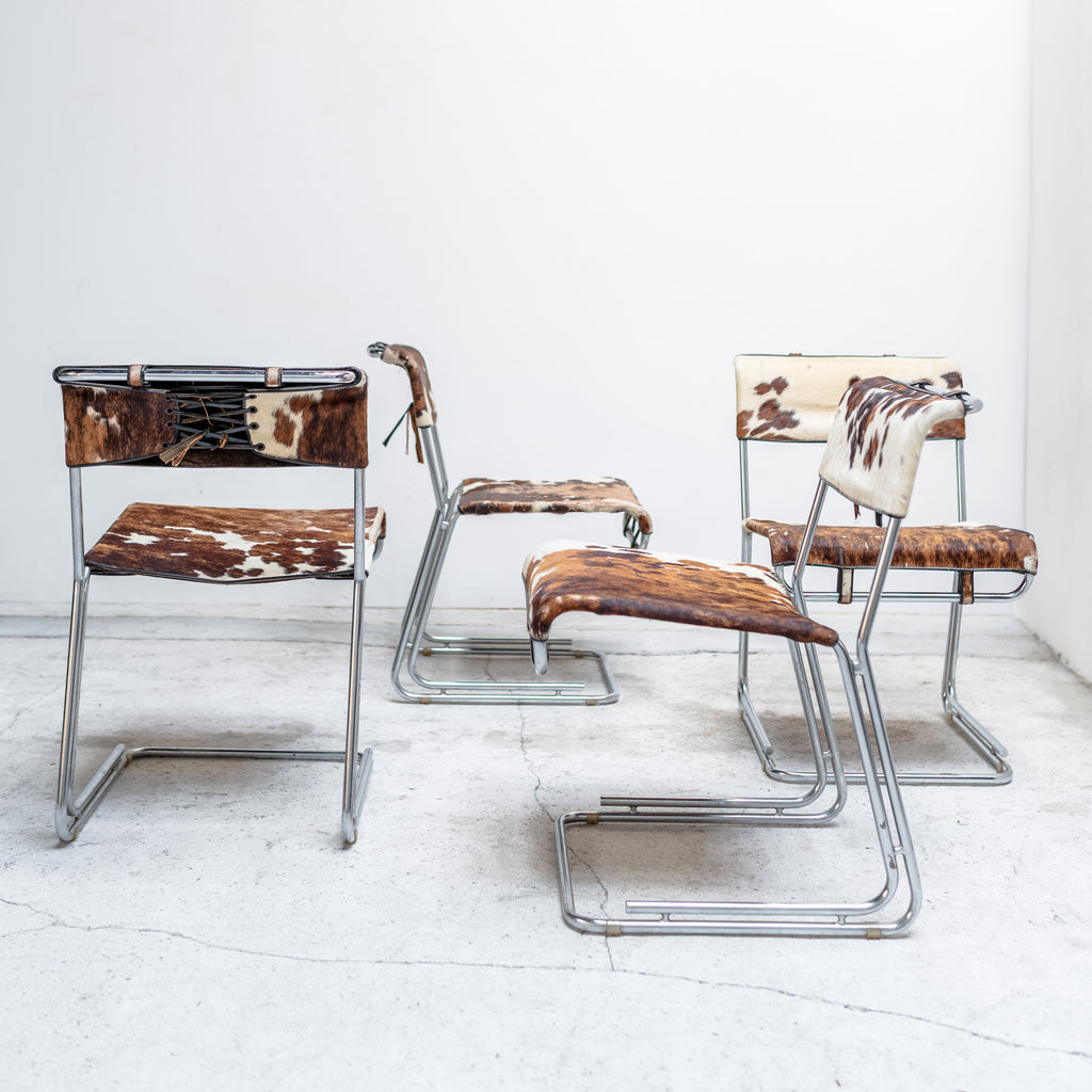 イタリア製のダイニングチェア4脚セット。クロームフレームに毛付きレザーを組み合わせ、個性ある表情と軽やかな造形が魅力です。