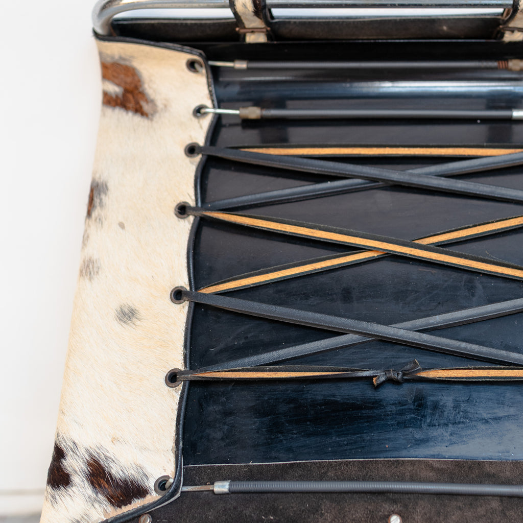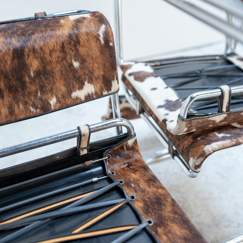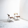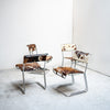 Featuring cantilevered chrome frames with unique upholstery, each chair combines sculptural lines with interesting natural variations. Comfortable in proportion yet visually light, these chairs capture the spirit of Italian design in the postmodern era: playful, experimental, and unafraid of bold material combinations.