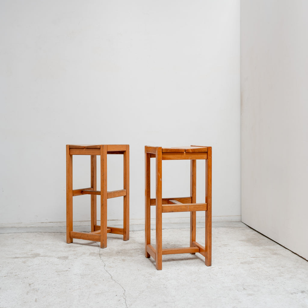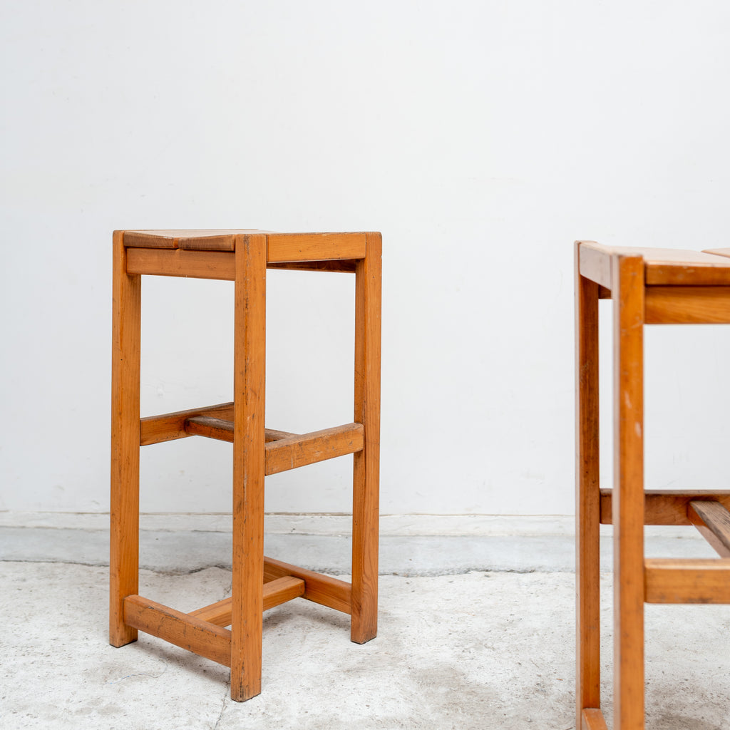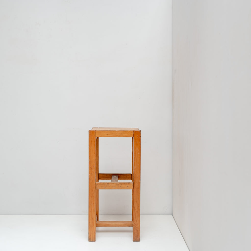 木製のスツール。建築的な直線フォルムと明快な構造により、椅子としての実用性はもちろん、空間に静かなアクセントを加える造形的な魅力も備えています。