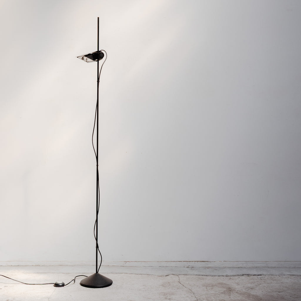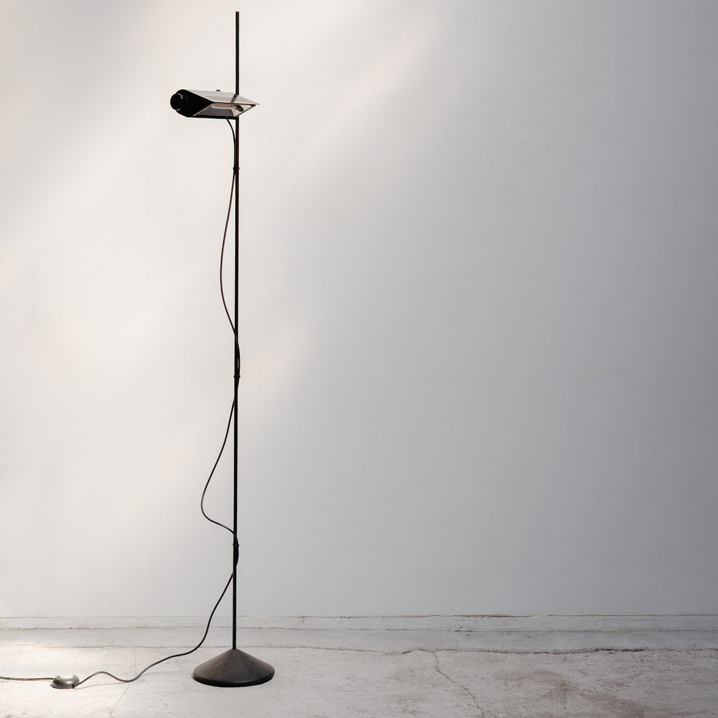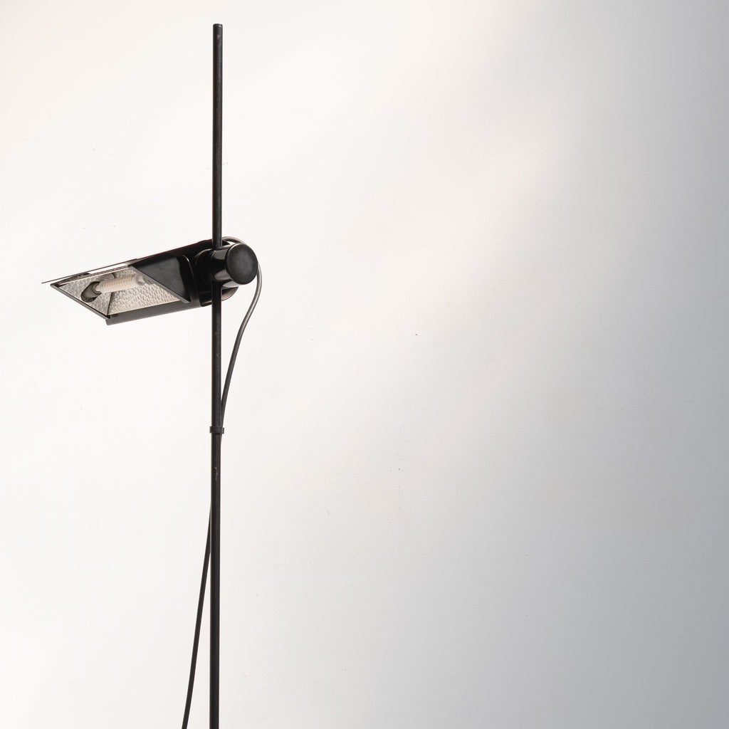 A sleek and architectural floor lamp designed by Raul Barbieri and Giorgio Marianelli for Tronconi. The minimalist structure highlights Italian industrial elegance, featuring an adjustable shade and slim black stem that create a refined, timeless silhouette.