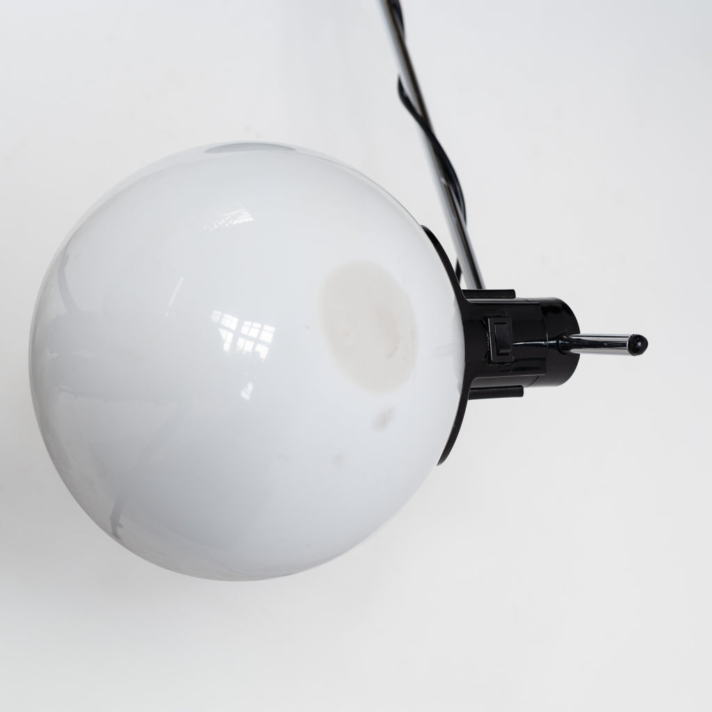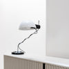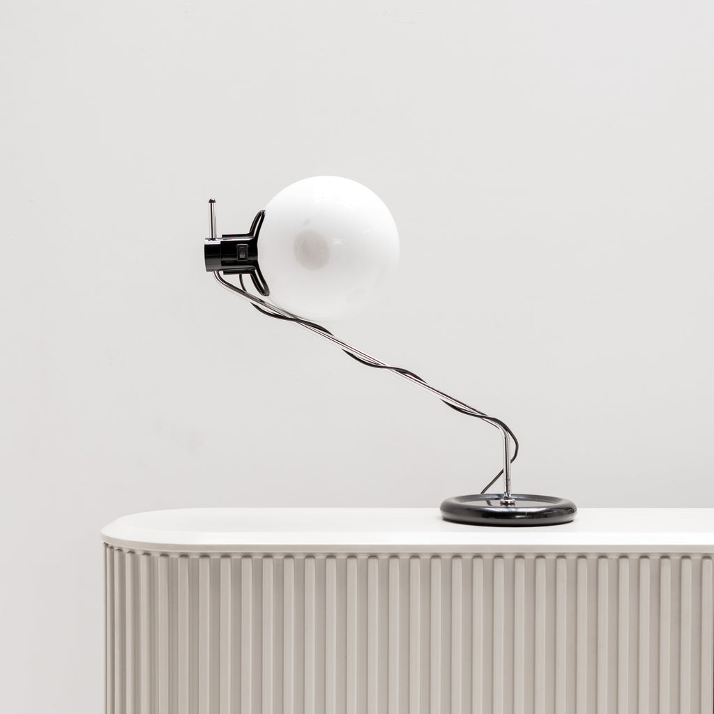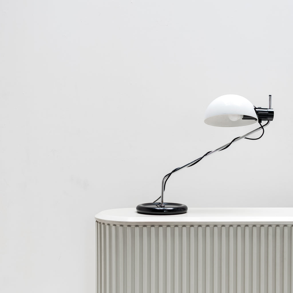 エミリオ・ファビオ・シミオンによる「Libellula」テーブルランプ。クローム仕上げのスチールアームと可動式のドームシェードが特徴。構造の精度とバランスの取れたフォルムに、1970年代グッツィーニ照明の洗練が感じられます。