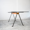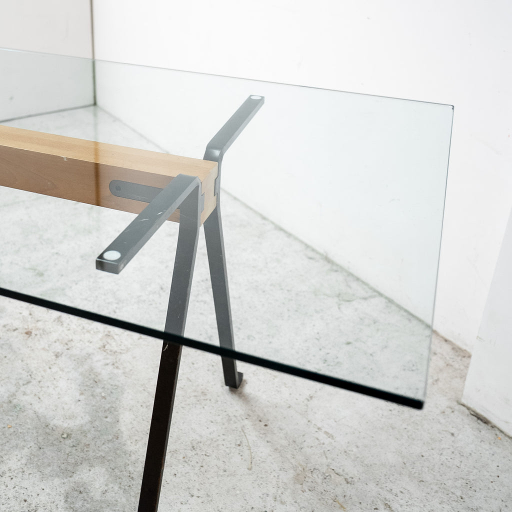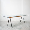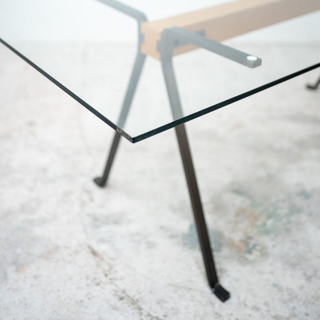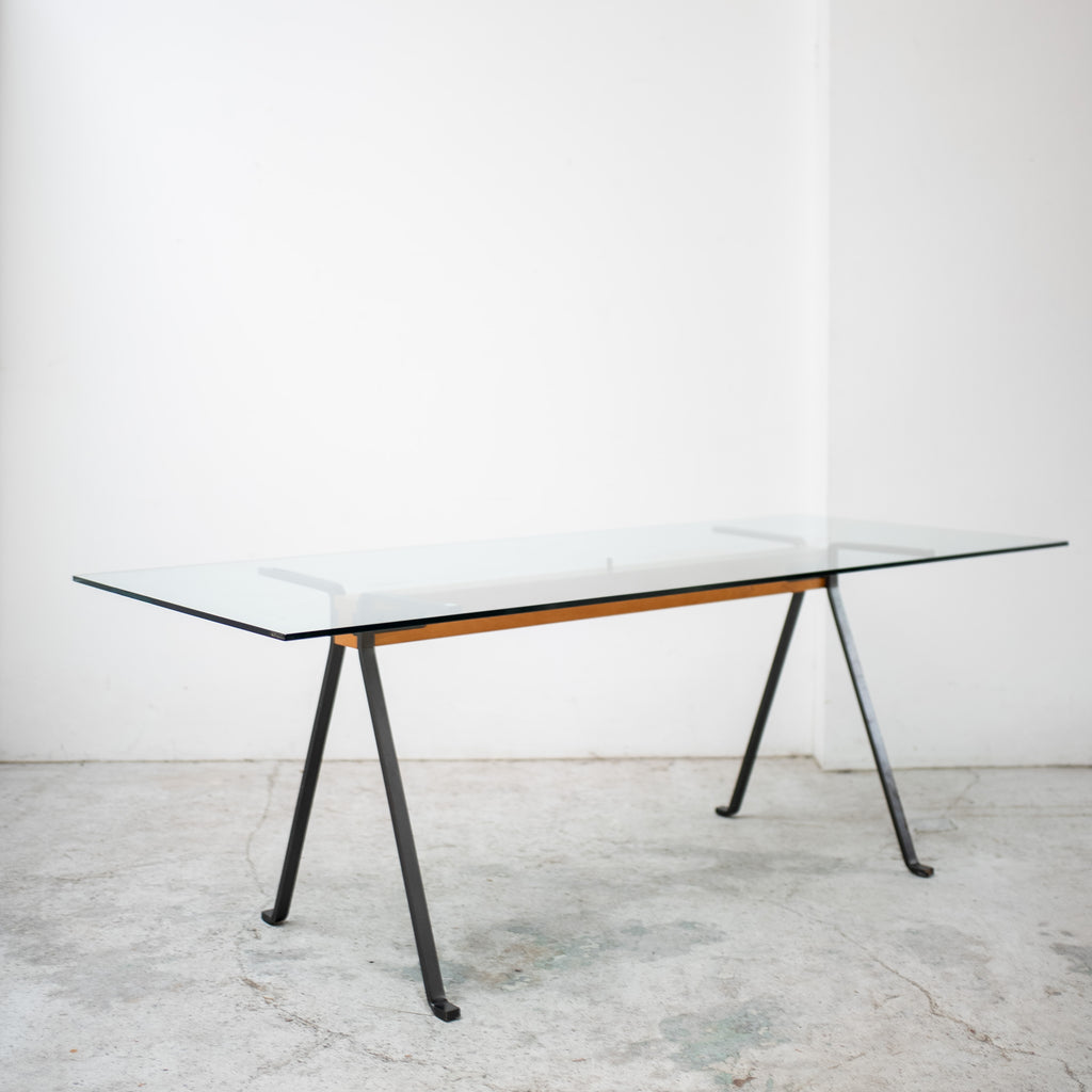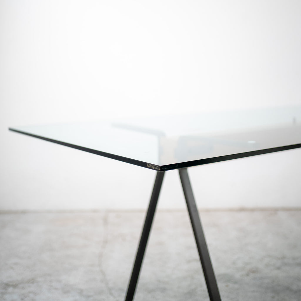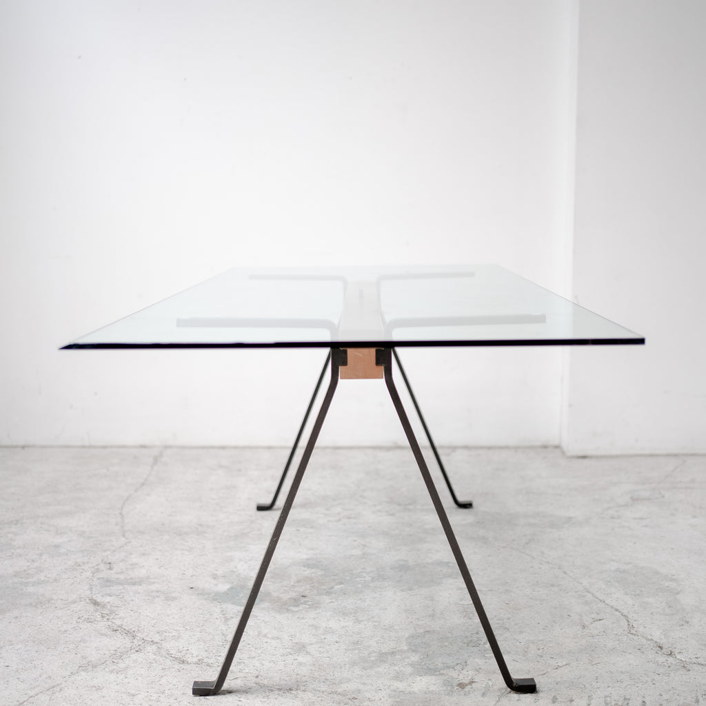 エンツォ・マリによるダイニングテーブル。ガラス天板を支える中央の木製ビームと、ブラックメタルの脚部による構造は、力強さと軽やかさを併せ持つ印象的なデザインです。構造そのものをデザインとして成立させるマリの思想が色濃く表れており、ダイニングテーブルとしてはもちろん、ワークテーブルとしても空間に強い存在感を与えます。