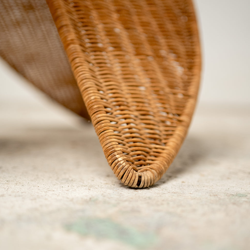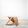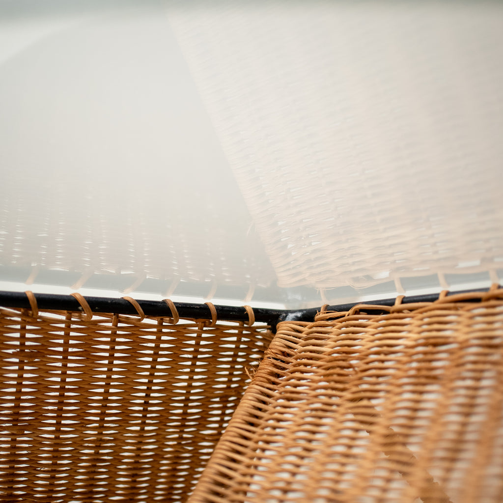 編み込みベースが印象的なガラストップのコーヒーテーブル。交差する有機的なフォルムが軽やかな動きを生み、下部の繊細な編み込みが温かみと奥行きを加えています。透明感のあるガラス天板と立体的なベースのコントラストが美しく、空間のアクセントとしても映える一台。ローテーブルとしてはもちろん、ディスプレイ台としても使用可です。