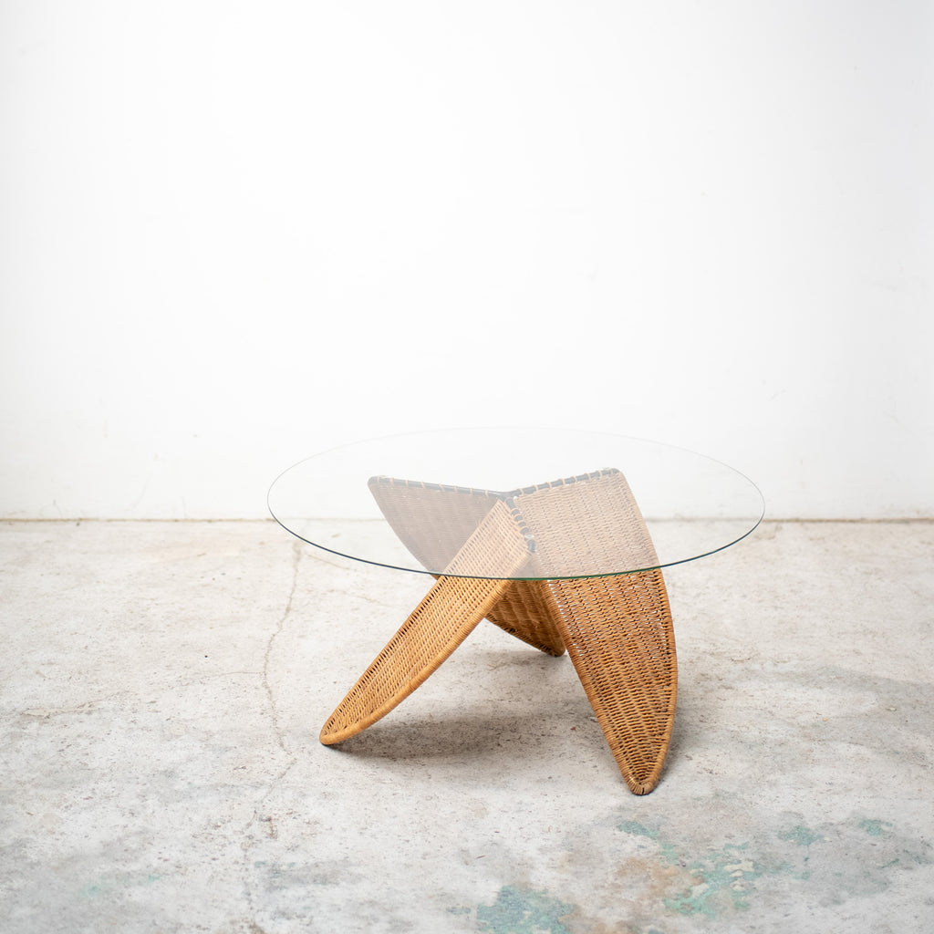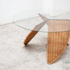 A sculptural coffee table featuring a clear glass top set on an expressive woven base. The dynamic, intersecting forms create a sense of movement and lightness, while the intricate weaving adds warmth, texture, and craftsmanship to the piece. An elegant statement piece that works equally well as a coffee table or a display surface.