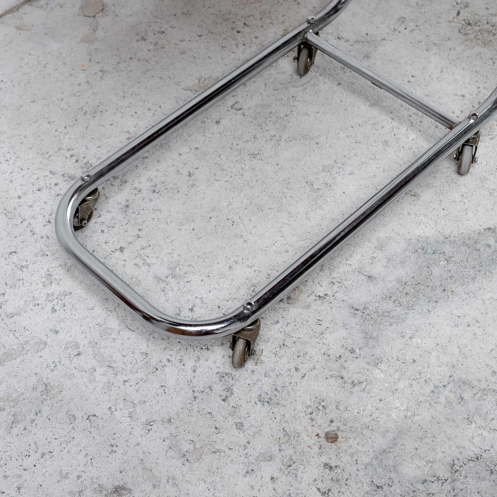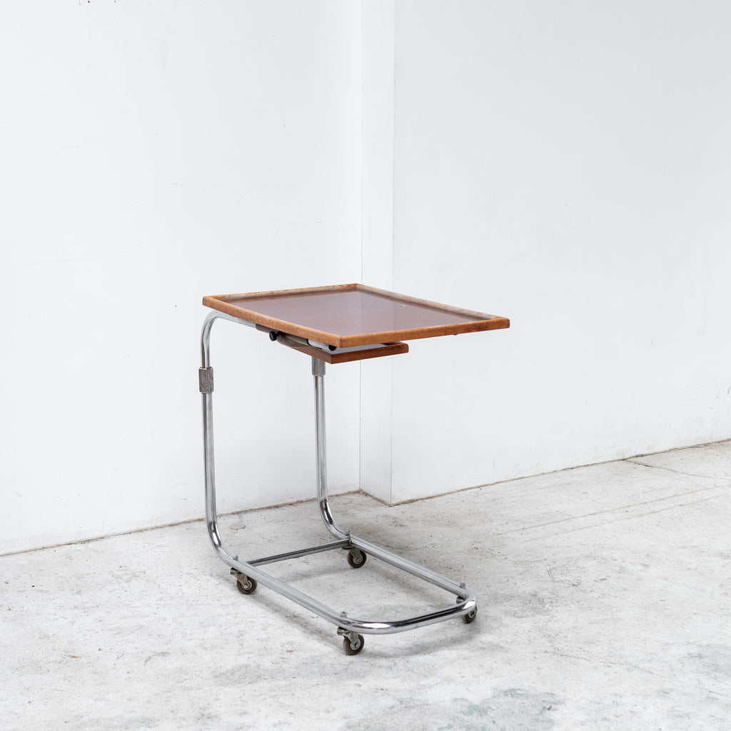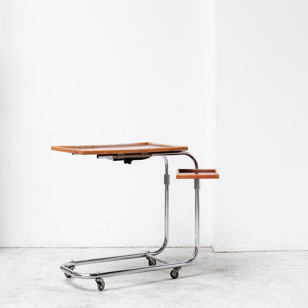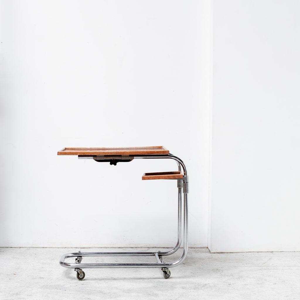 A functional and characterful adjustable side table. The design features a chrome tubular steel frame on casters and a height-adjustable mechanism. The bent metal structure gives the piece a light, architectural presence while maintaining practical stability. The smaller auxiliary platform enhances its versatility — ideal as a side table, reading table, or flexible workspace element.