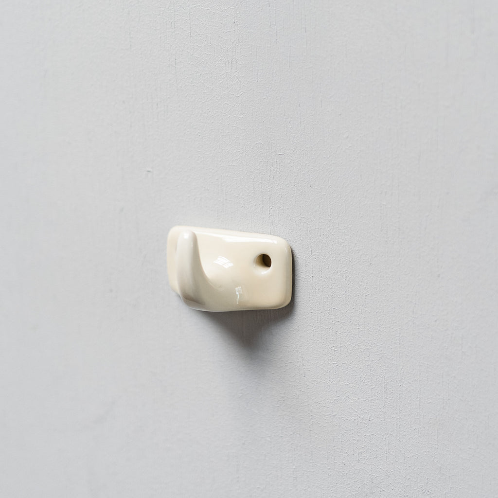 A compact ceramic wall hook with a softly rounded form and smooth glazed finish. The subtle volume and clean silhouette allow it to function both as a practical hook and a small decorative accent on the wall.