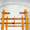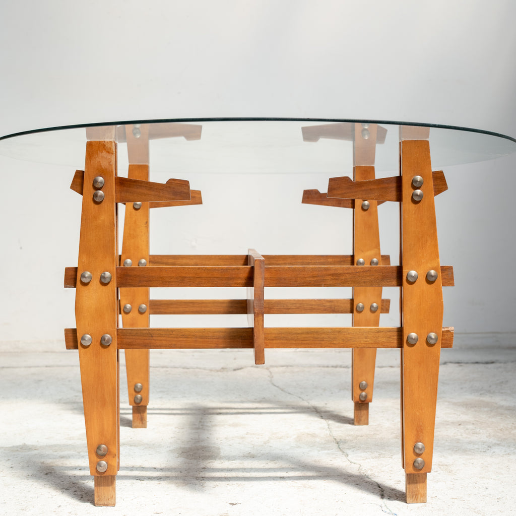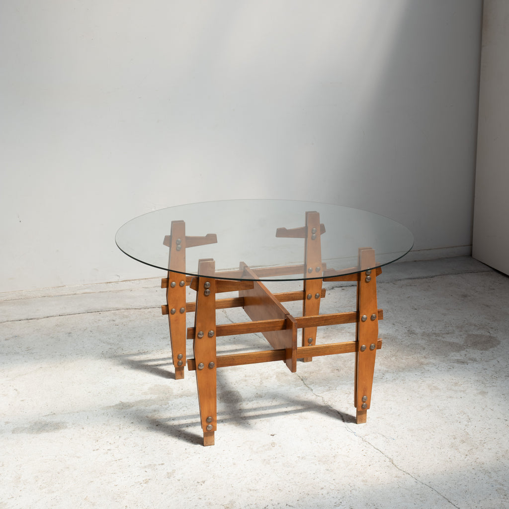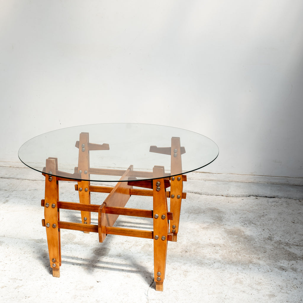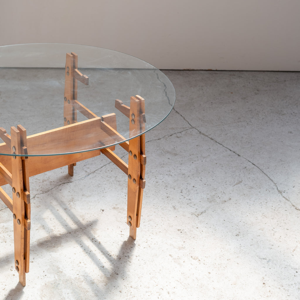 ラウンドガラスコーヒーテーブル。彫刻的な木製ベースと円形ガラストップが調和し、建築的な存在感と素材の温かみを兼ね備えています。