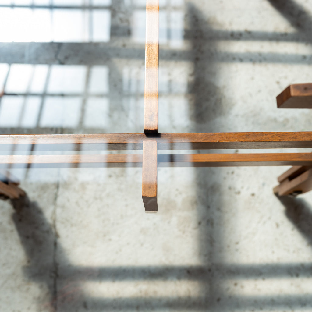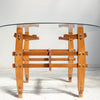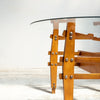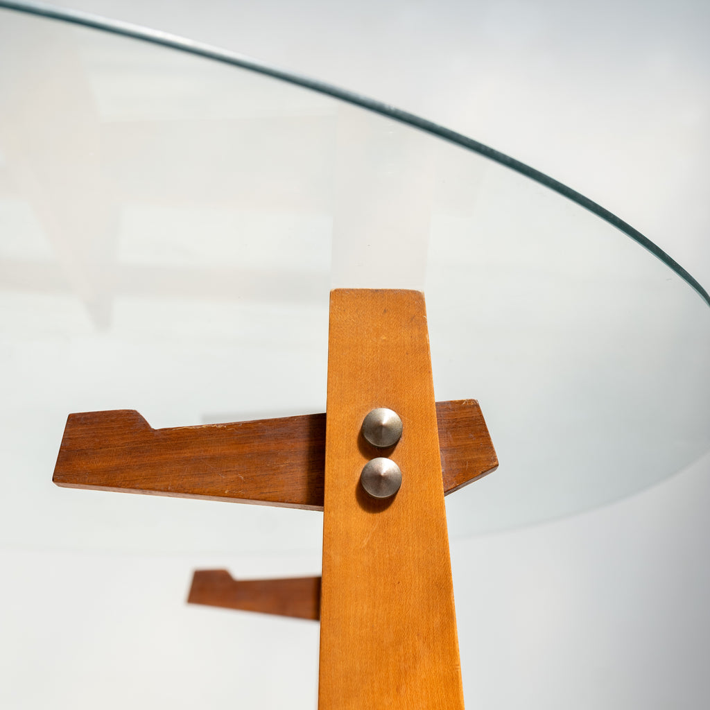 A striking design with a sculptural wooden base and circular glass top, combining architectural clarity with a warm material presence.