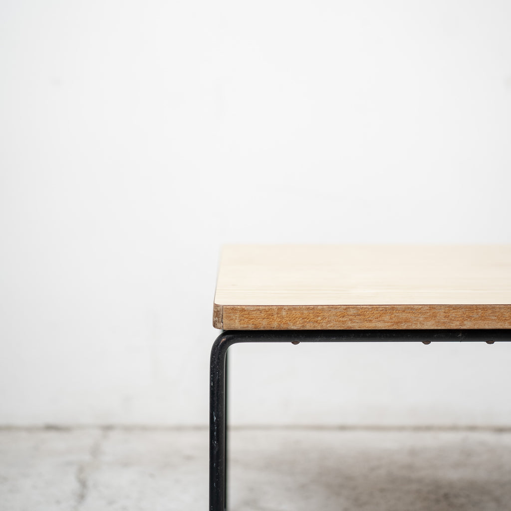 A side table designed by Pierre Guariche for Steiner, part of the VOLANTE series. Characterized by its minimalist construction, the table features a slender metal frame paired with a simple wooden top, achieving a balanced and architectural presence.