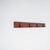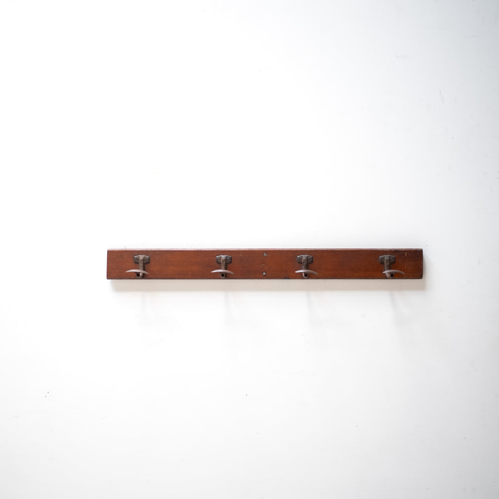 温かみのある無垢材のベースに、鉄製フックを組み合わせた、壁掛けタイプのコートラックです。異素材の構成が明確で、経年による鉄製の質感が全体に落ち着いた印象を与えています。