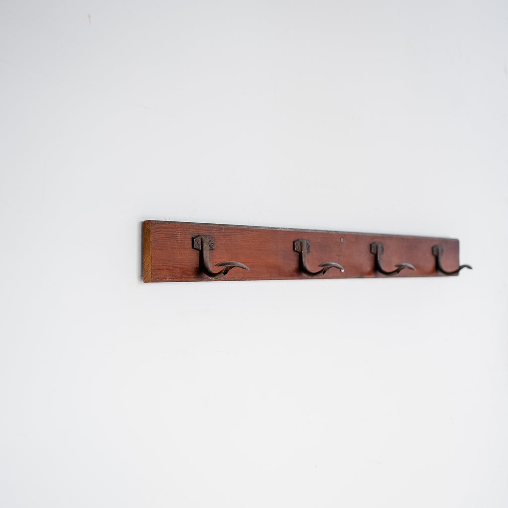 A refined mid-century wall-mounted coat rack featuring a solid wooden backplate paired with elegantly shaped hooks. The contrast between the warm wood and the softly patinated materials gives the piece a quiet, utilitarian charm.
